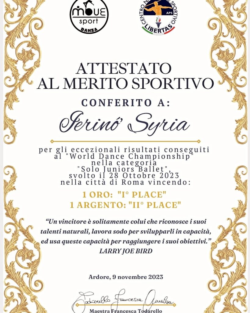 Premio Internazionale Concorso Edizione Festival Jazz di Roccella Jonica Sergio Pinchera come Danzatrice solista di Jazz.